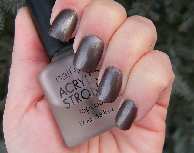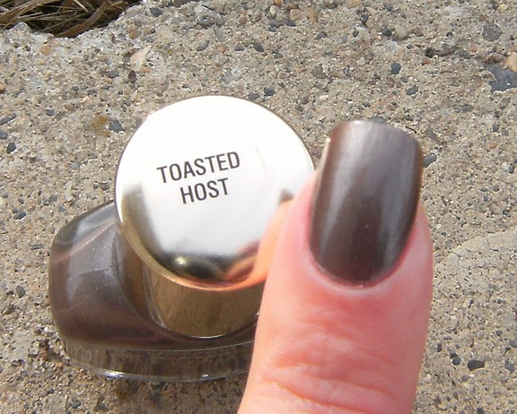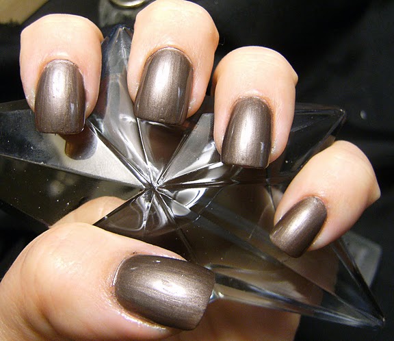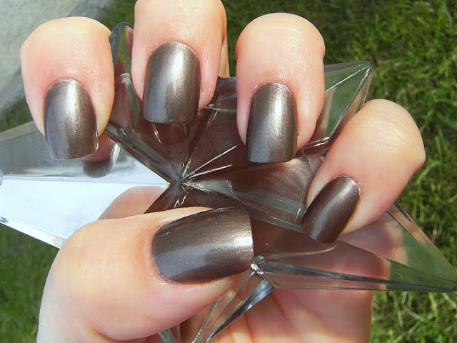 I am reluctant to admit that I have spent almost 45 minutes hunting around on the interwebz trying to find another photo of this polish, as well as a good description for it. I would say it is an "antique metallic dingy taupe". I found this at a discount store in my town I remember this polish from when it came out.... it is a long discontinued color. It was very thick & I did have some brush marks. Other than that I think this is a great color but I would like it to be more on the shimmer/creme side rather than how appears to have a subtle frost to it. It dried quickly, but that didn't stop me from adding a few dents and scrapes ( dang it! ) ~ But I will be layering another pretty polish over this shortly.